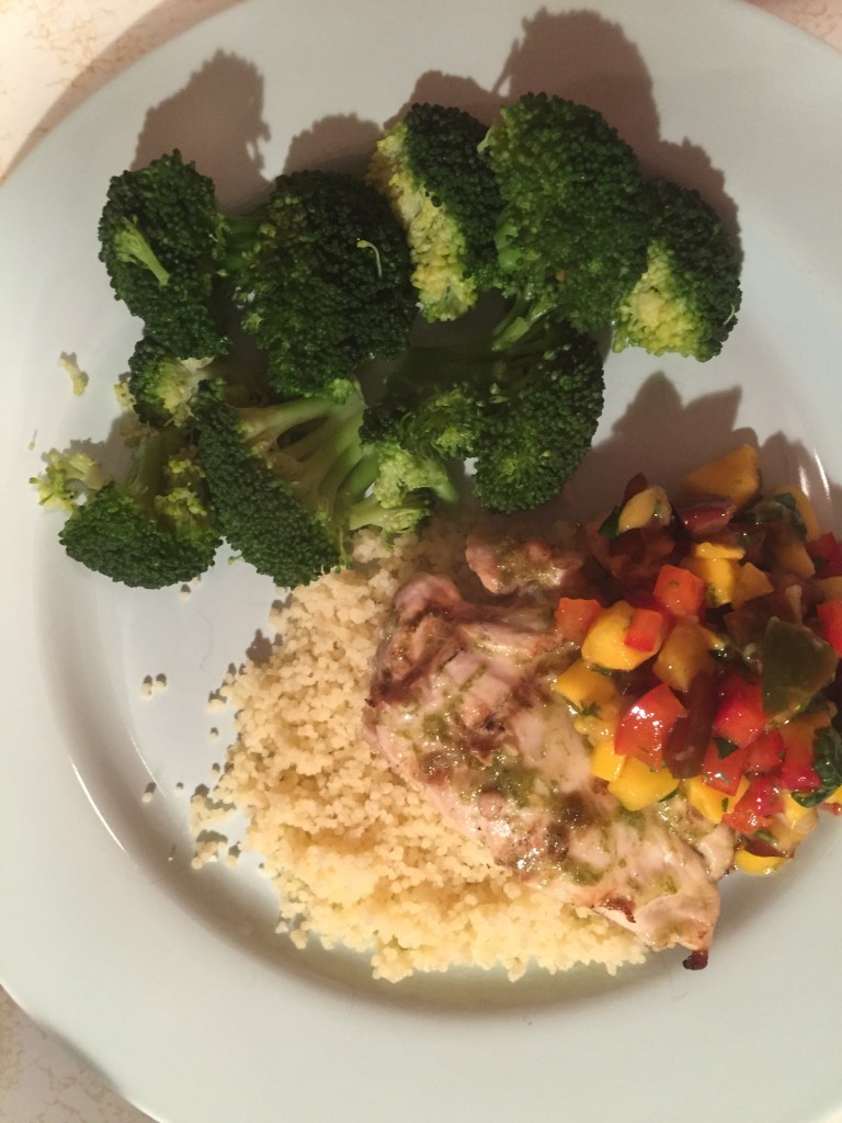 tomatoes. I replaced the fresh Serrano with cayenne pepper from the pantry. I also chose to replace the rice with lemon couscous. While the recipe calls for only four chicken breast, there was plenty of leftovers also