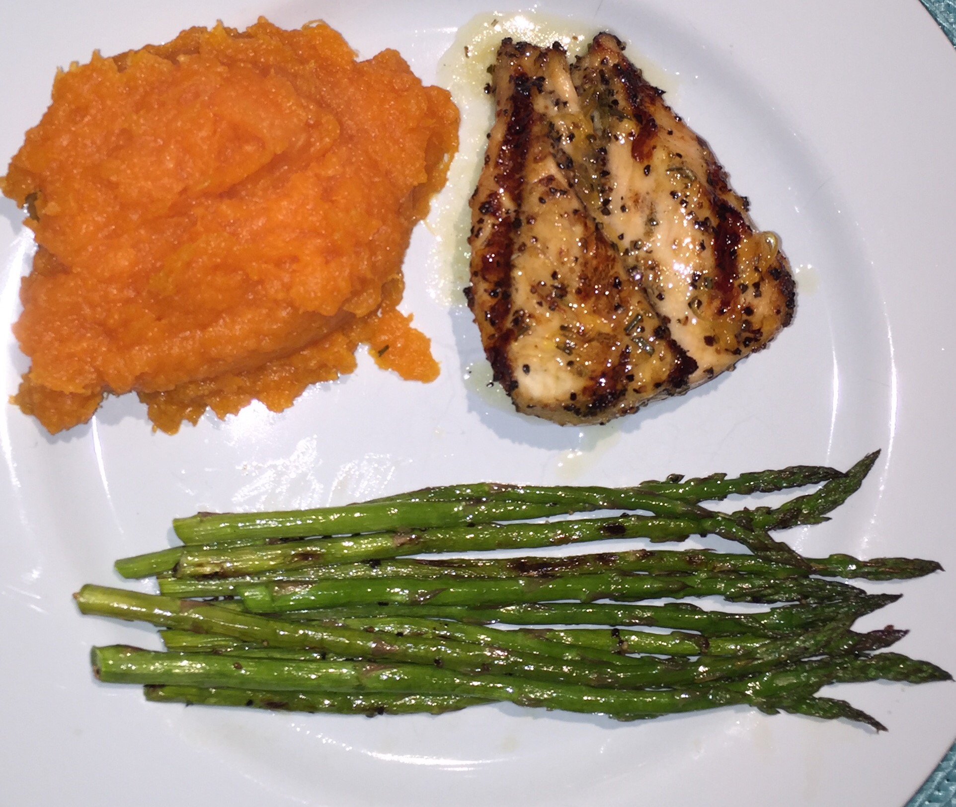 Unless your working with really large pieces, the chicken should be cooked thoroughly in 11 to 12 minutes. In the first instance I prepared the chicken with grilled asparagus and mashed sweet potatoes. Once everything is plated, add one to two tablespoons of the lemon syrup to the chicken with a few pieces of zest as garnish.