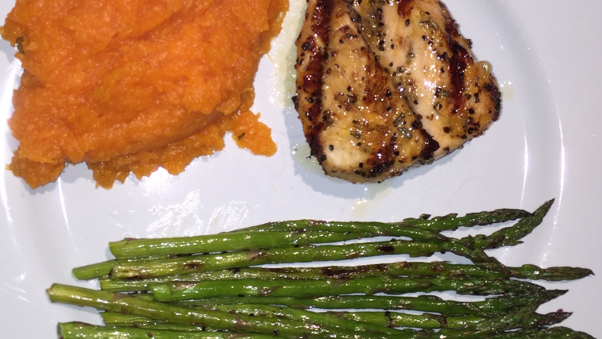 Unless your working with really large pieces, the chicken should be cooked thoroughly in 11 to 12 minutes. In the first instance I prepared the chicken with grilled asparagus and mashed sweet potatoes. Once everything is plated, add one to two tablespoons of the lemon syrup to the chicken with a few pieces of zest as garnish.