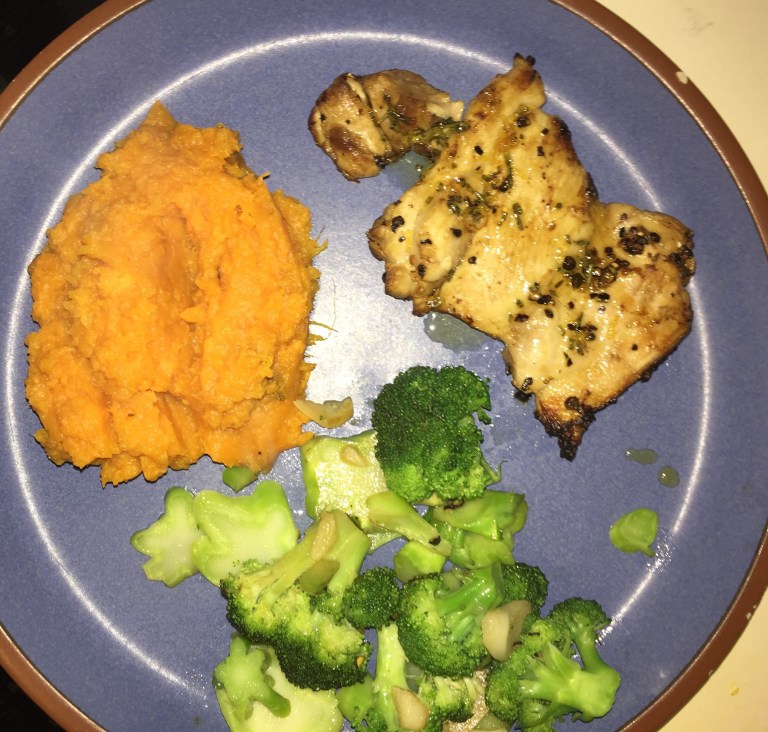 After making sure both sides were browned, I transferred them to a broiler pan. They were cooked though in 12 minutes. With no grill, I opted for sauted brocolli with sliced garlic and black pepper. Since I’m a sucker for sweet potatoes, we went with mased baked sweet potatoes.