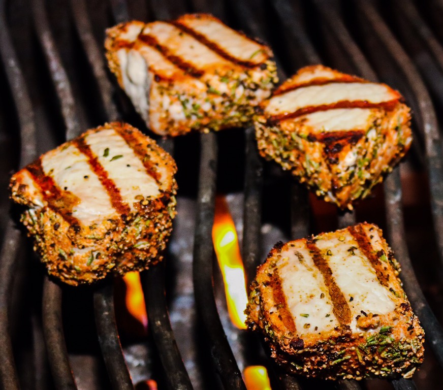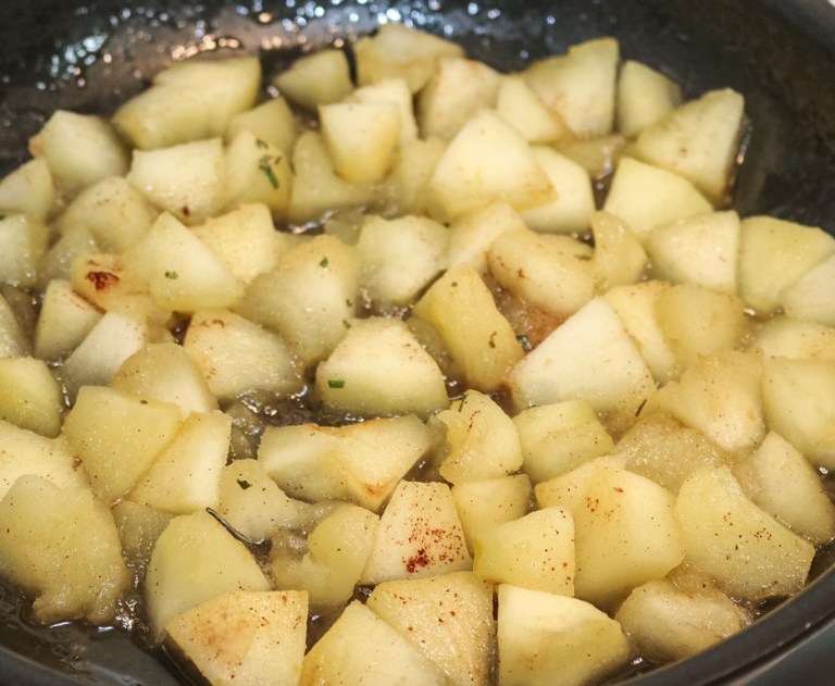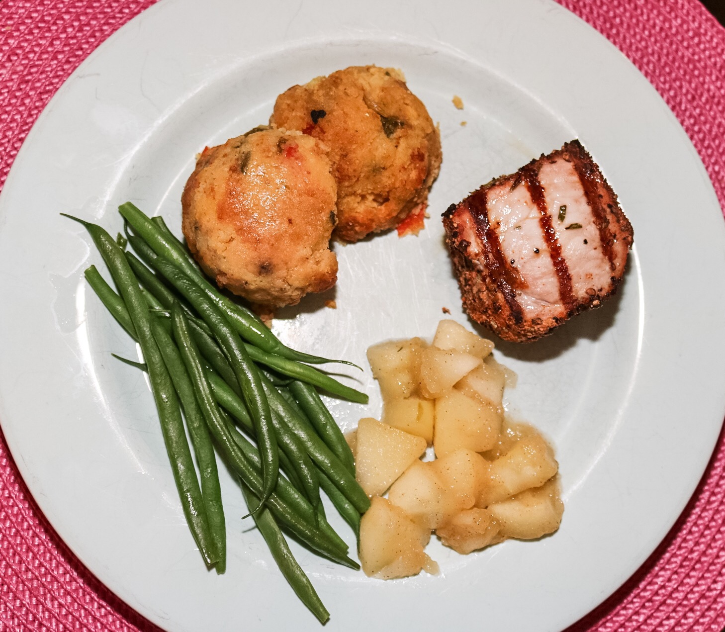 For our first cooked at home meal of the new year we had grilled pork chops with a dry rub of cracked pepper, kosher salt, paprika and chopped fresh rosemary. We paired the chops with sautéed granny smith apples with a rosemary simple syrup reduction, stuffin’ muffins (cornbread stuffing with onion, red bell pepper, fresh sage and whole black pepper corns, and green beans.
