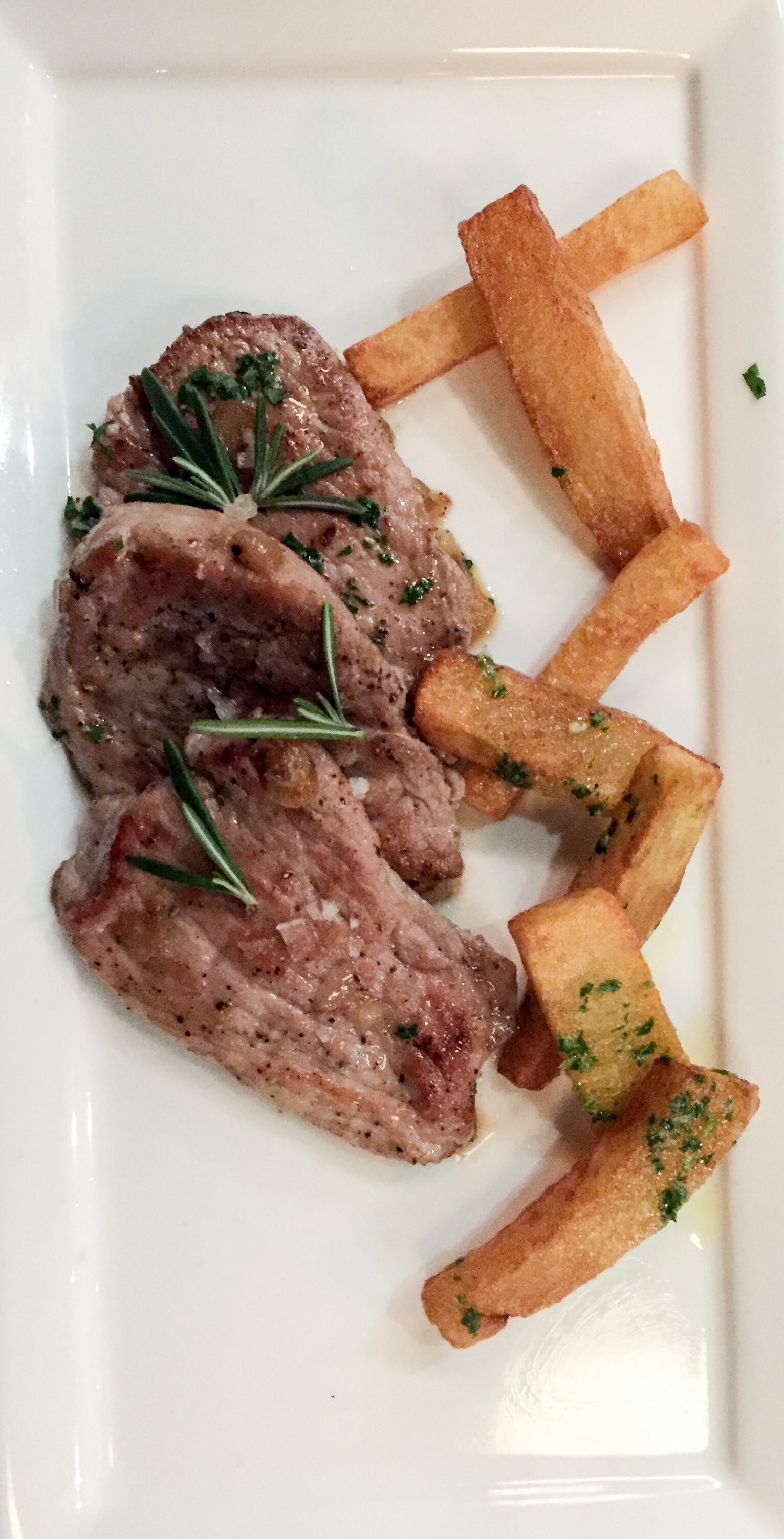The braised medallions of pork were seasoned with fresh garlic and cumin and served with Carmelized onions in a whiskey and brandy reduction, garnished with fresh rosemary and paired with French fries.