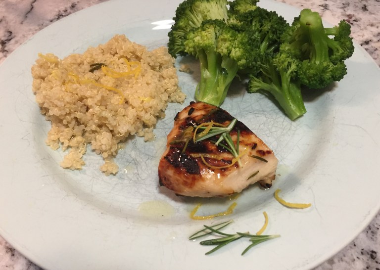 Grilled some chicken tonight. Marinated the chicken in lemon juice and olive oil for 30 minutes before grilling. Paired the chicken with quinoa and steamed broccoli. Drizzled a rosemary-lemon zest simple syrup reduction over the chicken and quinoa.