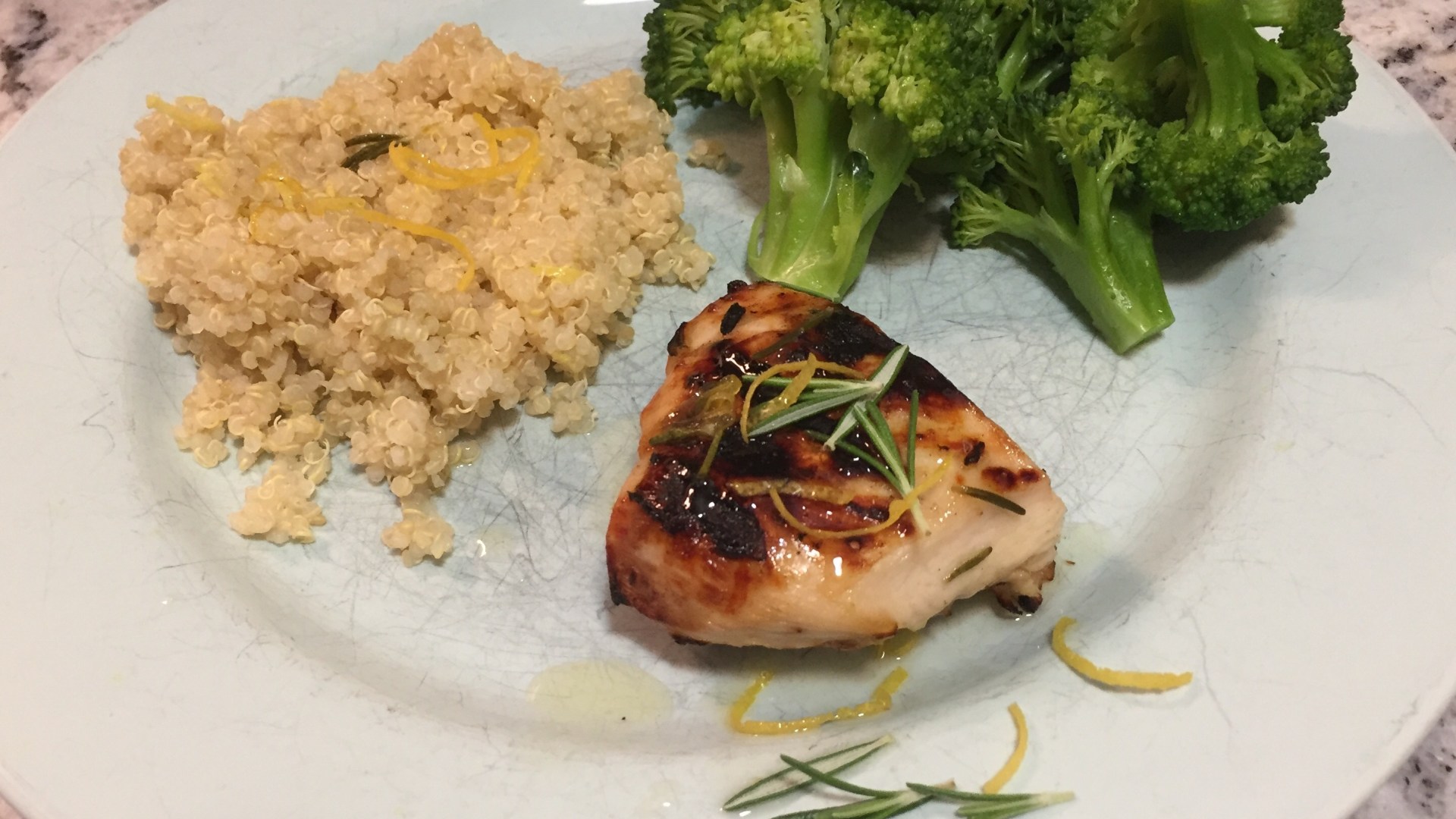 Grilled some chicken tonight. Marinated the chicken in lemon juice and olive oil for 30 minutes before grilling. Paired the chicken with quinoa and steamed broccoli. Drizzled a rosemary-lemon zest simple syrup reduction over the chicken and quinoa.