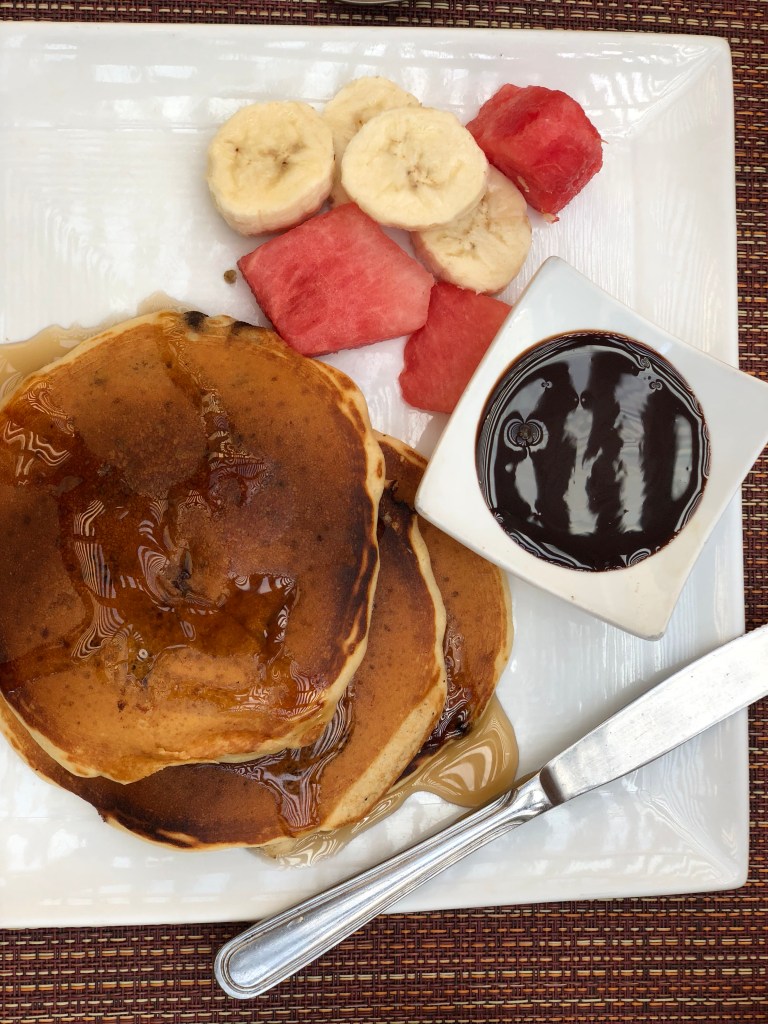 We started our 6th day in paradise with our best breakfast of the trip (to date) at Red Ginger, the onsite restaurant at the Phoenix Resort. Looking for something other than a traditional American breakfast or a breakfast sandwich, I found what turned out to be the best breakfast of the trip, Chunky Monkey Pancakes. Light and airy, the pancakes and chock full of banana slices and chocolate chips and served with fresh fruit and chocolate syrup.