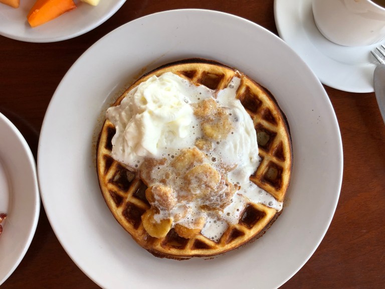 Day 6 stared with an amazing breakfast at Red Ginger. Day 7 started with an equally amazing breakfast at their sister restaurant, Blue Water Grill. Breakfast for this morning was a bananas Foster waffle. In the traditional preparation bananas are sautéed in butter and brown sugar with cinnamon and finished with rum and banana liqueur flambé. The waffle was light and served with bananas Foster topping and a healthy portion of whipped cream in lieu of the ice cream.