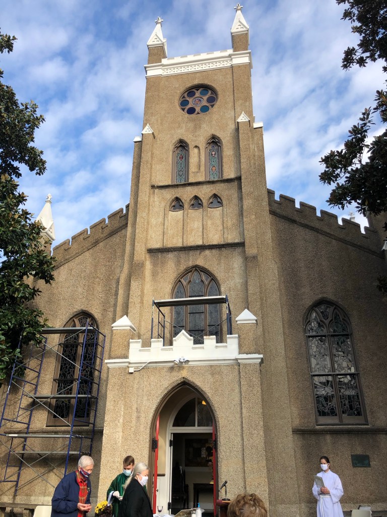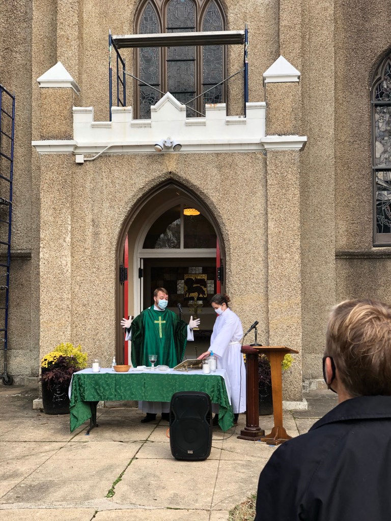We had our second successful outdoor service this morning at 9:00 AM at Christ Church Washington Parish. While it was a brisk 55 degrees, there were nearly 30 parishioners and visitors hear another great sermon from Father John and to receive communion. You’ll also note from the pictures that the window project is underway.